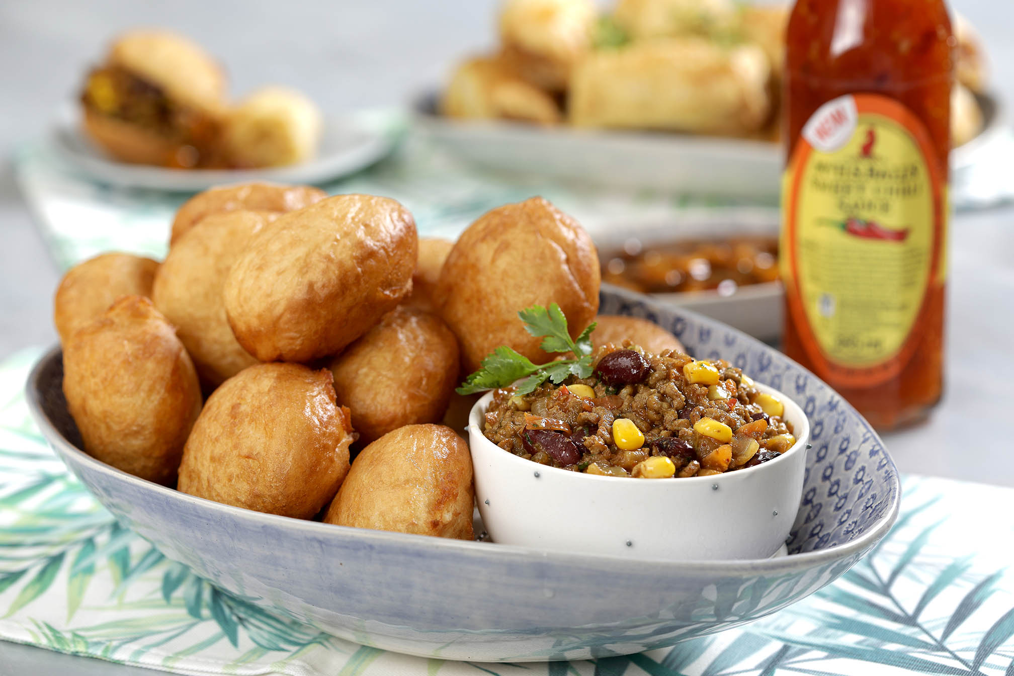 Serving suggestion: serve in vetkoek with grated cheddar cheese, as a pita or wrap filling or over baked potatoes with cheese. For snacks or finger food menu, simply reduce the size of the dough balls for the perfect bite sizes treat.